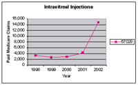 Figure. Between 1998 and 2002, the number of claims paid by Medicare for intravitreal injections increased 250.4%. |