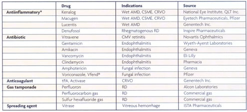 Table 1. Several substances for intravitreal injection are currently in use or under investigation. *Anecortave acetate (Retaane, Alcon) is an antiangiogenic synthetic analog of cortisol currently in clinical trials for the treatment of wet AMD, but the route of administration is sub-Tenon, not intravitreal. |