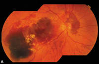 Polypoidal choroidal neovascularization is a primary abnormality of the choroidal circulation characterized by an inner choroidal vascular network of vessels ending in an aneurysmal bulge or outward projection. Clinically, it's visible as a reddish-orange, spheroid, polyp-like structure.20 The disorder is associated with multiple, recurrent, serosanguineous detachments of the RPE and neurosensory retina, secondary to leakage and bleeding from the peculiar choroidal vascular abnormality (Figure 6).21