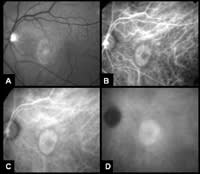 Fig. 2A: Red-free photograph of a patient with classic choroidal neovascularization (CNV). Fig. 2B: Early-phase ICG angiogram reveals hyperfluorescence of the CNV. Fig. 2C: Mid-phase; and Fig. 2D: Late-phase ICG angiograms show staining of the hyperfluorescent CNV. |