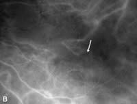 Fig. 5A: ICG angiogram of a patient with retinal angiomatous proliferation (stage II) illustrates a retinal-retinal anastomosis and subretinal neovascularization. Fig. 5B: Late-phase ICG angiogram shows intraretinal leakage (arrows) surrounding the fading angiomatous proliferation (arrowhead). |