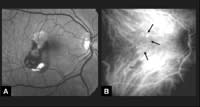Fig. 1A: Indocyanine green (ICG) angiography allows visualization of pathologic conditions through overlying hemorrhages as in this patient with polypoidal choroidal vasculopathy. Fig. 1B: Arrows indicate the polypoidal lesions. |