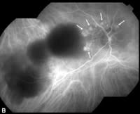 Fig. 7: This is a 66-year-old man with sudden deterioration of vision in his right eye. Fig. 7A: Color composite photograph shows large subretinal and intraretinal hemorrhages at the posterior pole and surrounding the optic nerve. There are areas with dense lipid exudation. Fig. 7B: Mid-phase ICG angiogram illustrates a large hyperfluorescent area. In the peripapillary area, a net of subretinal inner choroidal vessels terminates in polypoidal lesions (white arrows). |