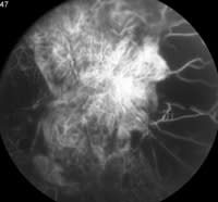 Figure 2. a. Massive neovascularization and total traction retinal detachment in a patient with PDR. b. FA at 47 seconds shows severe capillary nonperfusion and extensive neovascularization. |