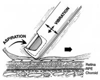 Several high-speed vitreous cutters are now available for diabetic vitrectomy and provide the advantage of more controlled vitreous removal and working on the retinal surface to remove complex diabetic membranes.23-26 (We utilize the Alcon InnoVit cutter for diabetic vitrectomy, although Bausch & Lomb and other companies have developed excellent cutters.) We have developed the technique of indentation delamination for removal of diabetic membranes and the concept of "one-step" diabetic vitrectomy (Figure 2). The high-speed cutters can be used to delaminate membranes from the retinal surface and, in the majority of cases, eliminate the need for forceps, scissors, endodiathermy, healon dissection of membranes and other maneuvers traditionally used to manage these complex patients.23