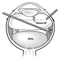 rubeosis, silicone oil may be preferable and the retina may be attached using the sandwich technique of flattening the posterior retina with perfluorocarbon and the anterior retina with a direct silicone oil-fluid exchange. |