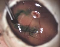 Figure 1. Injection of ICG in low concentration and directed to the macular prevents staining of the retina elsewhere, and minimizes the amount of dye left intravitreous. |