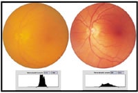 | Figure 2. Image of the fundus preoperatively on the left and postoperatively on the right demonstrating improved image contrast (corresponding histograms below each image) | |
