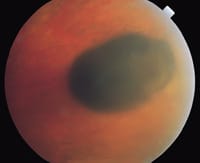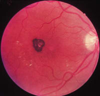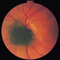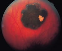 Congenital simple hamartoma of the RPE appears ophthalmoscopically as a small localized, elevate black lesion that is usually located in the foveal region (Figure 2). It is usually <1 mm in diameter. Unlike CHRPE, it is distinctly elevated. The lesion generally remains stationary and is not known to grow.
