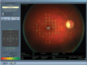 Standard perimetry is not as precise a method of evaluating retinal disease because central vision loss can make fixating on a target nearly impossible. "Standard computerized visual field testing has algorithms for testing the central macula, but they require that the patient fixate on a target or participate in some other method for maintaining steady fixation, and they do not test nearly as many points through the macula [as the MP-1]. Standard perimetry is crude by comparison," notes Dr. Rosenthal. Microperimetry, on the other hand, uses automatic fixation tracking technology to eliminate the need for patient fixation. "Essentially, the MP-1 has taken the patient compliance portion of the information gathering process out of the picture, and to that extent it is much less subjective," says Dr. Rosenthal.