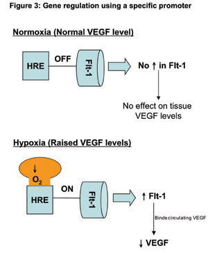 In order for gene therapy to be safe and effective, it is important that techniques are developed to control the expression and behavior of the gene following insertion. Simple introduction of a therapeutic gene may not be sufficient in the long run if the protein product is produced at concentrations that are either too low or too high for the desired therapeutic effect. Careful regulation of gene expression, and therefore the levels of gene product, can be achieved using a relevant promoter element on the gene to deliver protein to the target tissue. Examples of this approach include the use of rhodopsin promoters in the photoreceptors, or PEDF promoters in the retinal pigment epithelium (RPE) and choroid, to regulate gene expression. Altered gene expression can also be secondary to changes in the cellular microenvironment such as hypoxia; here it is possible to use hypoxia-sensitive response elements (HRE) to regulate the expression of anti-angiogenic genes (Figure 3).