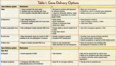 Modified viruses are the most common vectors used in gene therapy as they allow effective intracellular delivery of genetic material. Several factors are important in determining the ideal viral vector for a certain therapeutic use, including the predilection of the viruses for certain tissues and cells, and the size of the DNA fragment that can be inserted with a given vector (eg, adeno-associated virus and photoreceptors).8 Potential viral vectors for ocular use include adenovirus, adeno associated virus, retroviruses, and lentiviruses.