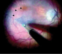 Figure 2. Operating microscope view demonstrating the continuous ILM peel in progress. A triangular flap of ILM is seen being peeled by forceps. Arrowheads indicate the area of ILM peeled in contrast with the unpeeled trypan blue stained ILM. |