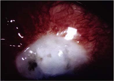 Endophthalmitis develops in 1% to 3% of eyes after aqueous humor shunt implantation and 0.3% to 1.8% of eyes after trabeculectomy. This has been of increased concern since the introduction of antifibrotic agents such as mitomycin C, which can lead to more thin-walled, avascular, and leaky blebs (Figure 4). The incidence of late blebitis following trabeculectomy with antifibrotic agents has been reported to be 5%.22 Some studies have suggested that the use of mitomycin C increases the incidence of endophthalmitis23, while others have not found such a trend,1 but no studies have been sufficiently powered to demonstrate a statistically significant increase.24 Early infections occurring within the first month of surgery are thought to be secondary to intraoperative contamination. Late-onset endophthalmitis can occur years after glaucoma surgery and probably arises from transconjunctival spread of bacteria through a bleb leak or an exposed tube. Thus, part of the management of bleb-associated endophthalmitis should be repair of a bleb leak if present. Similarly, if a glaucoma tube is eroding through the overlying conjunctiva, it should be covered with a scleral or pericardial patch graft, and if endophthalmitis occurs in the setting of an eroded or exposed tube, the aqueous humor shunt device should be removed. If the tube is not exposed, it may not be necessary to remove the device.2,4