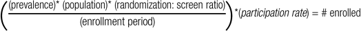 The algebra used to make site enrollment estimates is relatively straightforward. Known variables, such as prevalence of disease and local population size, combined with estimates, such as the participation rate, can be analyzed with simple arithmetic. The following equation demonstrates 1 method:2