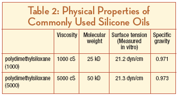 At a specific gravity of 0.97, silicone oil is slightly lighter than water and a silicone globule will float on a residual aqueous base inside the eye. The resulting buoyant force is only one-thirtieth of that contained within a corresponding gas bubble.25 Because silicone oil is not miscible with the aqueous phase, the resulting interface develops surface tension, but at 20 to 40 mN/m this tension is one-half to one-third of a gas bubble's surface tension. In combination, these 2 forces are sufficient to postsurgically support the reattached, tension-free retina, but residual or recurrent radial traction, especially in the inferior half of the retina, can lead to re-detachment under oil.26 This is important to consider in cases of PVR, when pathology tends to be concentrated inferiorly or can recur in this location.27,28 Table 2 summarizes the physical properties of common silicone oils.