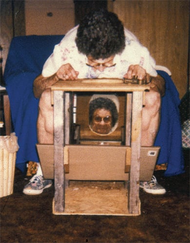 Although commercial devices are quite helpful, a creative patient can achieve satisfactory comfort using household items. For example, many patients spend waking hours resting their heads on pillows supported by a snack table (Figure 5). Leaning over the edge or side of the bed with pillows supported on a chair, using a small table, or even using a gap between mattresses to support the head while lying down may also be effective.