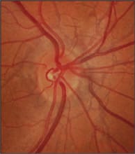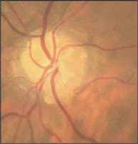 Figure 4. In this color photograph, the optic nerve drusen appear as globular, yellowish nodules on the surface of the optic disc (left).