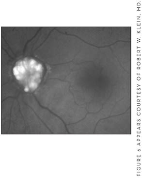 ■ Autofluorescence. This is a noninvasive exam that characteristically shows the phenomenon of autofluorescence, most evident in exposed drusen (Figure 6).
