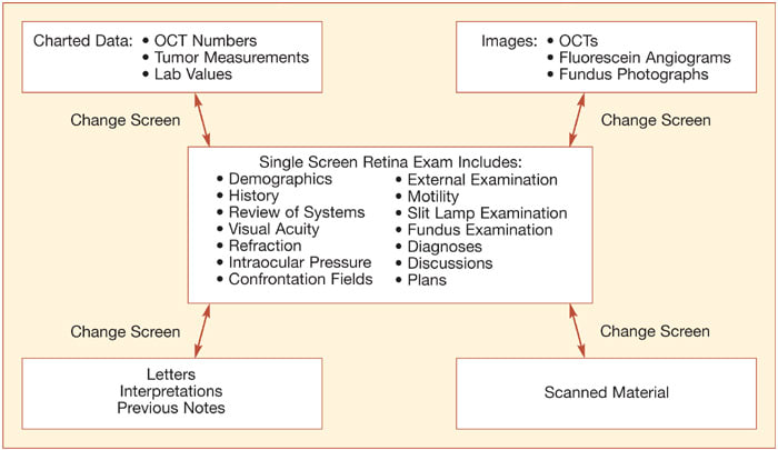 We realized that, in our multiple-specialty practice, generic EMR products did not adapt well. This was especially true for ophthalmology. The set of screens needed, the large degree of quantitative rather than verbal data obtained in an ophthalmic examination, and the graphical nature of much of the input made generic systems of limited usefulness in an ophthalmic context. We found that a product designed from the outset for ophthalmology was an easier sell to the doctors in the practice who did not want to abandon paper records in the first place. Not only are generic EMRs ill suited for ophthalmology, they are especially poorly suited for practices that house retinal specialists, who use images more intensively than general ophthalmologists.