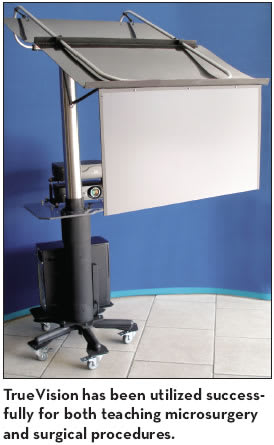 • TrueVision Systems’TrueVision Microsurgery Teaching System is a 3-D vision system for microscopes that frees users from looking through eyepieces. It is an ideal teaching and collaboration tool for ophthalmology and other disciplines where a microscope is used, allowing everyone to see the same image as if they were looking into the microscope, says TrueVision Systems. The optical 3-D image viewed through the microscope, is converted by TrueVision to a 3-D high-definition digital image, which can be displayed on a projection screen in real time, transforming stereomicroscopes into more ergonomic and collaborative devices.