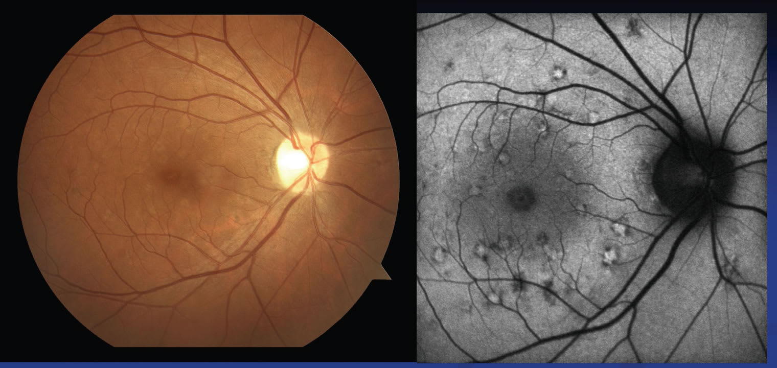 Figure 4. Multiple chorioretinal spots from infection with West Nile Virus are subtle on color photography but prominent on autofluorescence imaging.