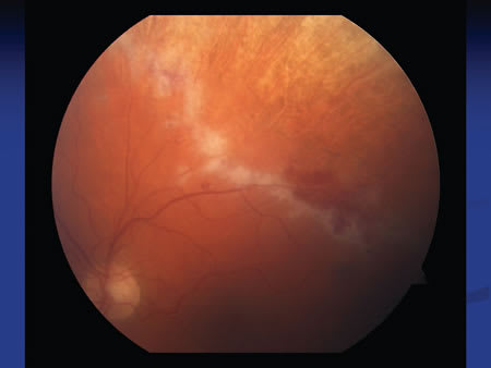 Figure 3. Cytomegalovirus retinitis. Note the full thickness retinal necrosis with advancing granular border and retinal hemorrhage. Fundus photography can be important in tracking disease progression.