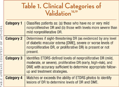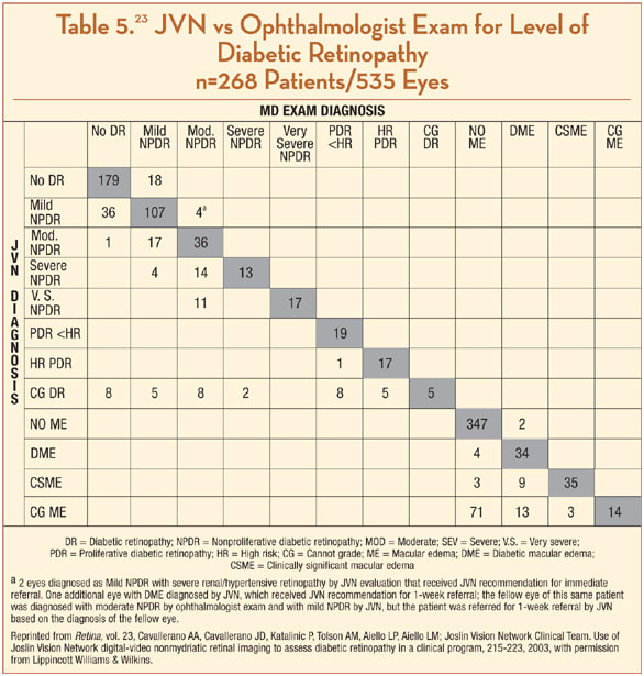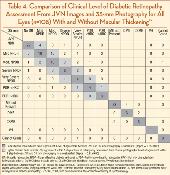 A prospective study validated the ability of the JVN to determine clinical levels of DR and DME, timing of next retinal evaluation, and need to refer to ophthalmology specialists using JVN stereoscopic nonmydriatic digital-video color retinal images as compared to ETDRS 7-standard fields 35-mm stereoscopic color fundus photographs (ETDRS photos).22 The study enrolled 54 patients (108 eyes) with type 1 or type 2 DM with various levels of DR and DME. Nonsimultaneous 45°-field stereoscopic digital-video color images (JVN images) were obtained according to JVN protocol prior to pupil dilation. Following pupil dilation, ETDRS photos were obtained. JVN images and ETDRS photos were graded on a lesion-by-lesion basis by 2 independent, masked readers to assess ETDRS clinical level of DR. An independent retinal specialist adjudicated inter-reader disagreements in a masked fashion. ETDRS clinical level of DR, timing of next ophthalmic evaluation of DR, and need for prompt referral to retinal specialist were compared.