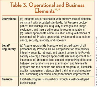 The ATA Practice Recommendations defined 4 clinical categories of assessment for validation (Table 1). Technology considerations addressed the following areas: image acquisition, compression, analysis, data communication and transfer, display capabilities, archiving and retrieval, security, reliability and redundancy, and documentation. The recommendations are summarized in Table 2. Operational and business recommendations are summarized in Table 3. Importantly, by clearly defining and applying standards, the Telehealth Practice Recommendations for Diabetic Retinopathy apply evidence-based clinical care to ocular telemedicine for DR.
