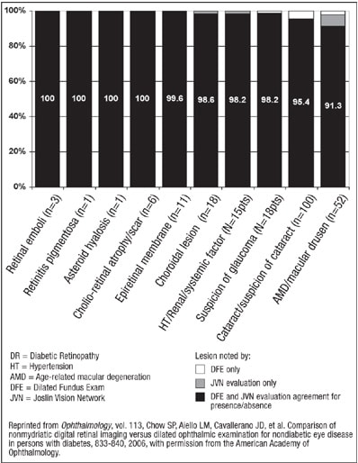 Because inability to identify significant nondiabetic-related eye disease would pose a serious shortcoming to any DR telemedicine program, a study was conducted to evaluate the ability of the JVN to detect ocular pathology other than DR in patients with DM compared with dilated retinal examination by retinal specialist ophthalmologists.25 A retrospective chart review of 280 Joslin Diabetes Center outpatients (560 eyes) with type 1 ortype 2 DM who had both JVN imaging and clinical comprehensive eye examination by retinal specialists at the Beetham Eye Institute of the Joslin Diabetes Center was conducted. Nonsimultaneous stereoscopic nonmydriatic digital retinal images (640 × 480 pixels) of three 45° retinal fields were acquired and graded for clinical level of DR and other ocular pathology by certified readers according to JVN protocol. Findings from JVN digital images were compared with findings from dilated retinal examination by retinal specialists performed within an average of 39.6 days of digital imaging. An independent senior retinal specialist adjudicated disagreements by review of JVN images and ETDRS photos when available.
