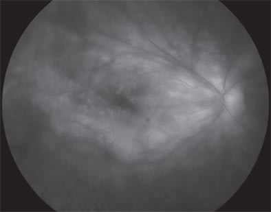 Figure 2. Color fundus photograph of the left eye of a patient with a 26-year history of birdshot retinochoroidopathy demonstrating optic nerve pallor and extensive chorioretinal atrophy and scarring. Visual acuity is 20/40 in the left eye and 20/30 in the less-affected right eye, with no angiographic cystoid macular edema or retinal vasculitis in either eye. (Right eye is not shown.)