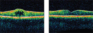 Figure 3. Optical coherence tomography demonstrating uveitic cystoid macular edema before and after intravitreal bevacizumab (Avastin, Genentech) injection.