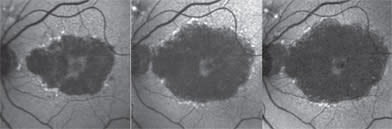 In patients with advanced atrophic AMD, FAF imaging may also helpful to develop and assess new emerging therapeutical strategies. Visual cycle modulators, which aim to target the detrimental accumulation of toxic lipofuscin in the RPE, appear as appealing pharmaceutical agents to slow down the progression of atrophy. One prominent agent is fenretinide (N-[4-hydroxyphenyl]retinamide), an oral compound that has been shown to lower the production of toxic fluorophores in the RPE in a dose-dependent manner in the albino ABCA4 -/- mice.27 This vitamin A derivate acts by competing with serum retinol for the binding sites of retinal-binding protein and promotes renal clearance of retinol. The bioavailability of retinol for the RPE and photoreceptors is consequently reduced and less toxic retinoid byproducts such as A2-E may be generated. A phase 2, randomized, double-masked, placebo-controlled multicenter study that aims to include over 200 GA patients, was initiated in the United States in 2006 by Sirion Therapeutics, Inc. (Tampa, FL). The therapeutic concept of fenretinide is underscored by previous FAF findings. To reduce the observational period in a slowly progressive disease, to minimize the sample size, and to better demonstrate possible treatment effects, the patient recruitment in this study involves the identification of high-risk features in this first large interventional trial in patients with geographic atrophy secondary to AMD.