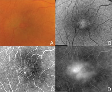 Figure 1. Idiopathic juxtafoveal telangiectasia Type 2a shown by fundus photography (A), fundus autofluorescence (B) and early- (C) and late-phase (D) fluorescein angiography. No obvious alterations are visible by fundus photography. Fluorescein angiography shows telangiectatic vessels in the parafovea and late-phase hyperfluorescence. Fundus autofluorescence imaging reveals markedly increased levels of the central fovea as opposed to the typical decreased signal in normal subjects.