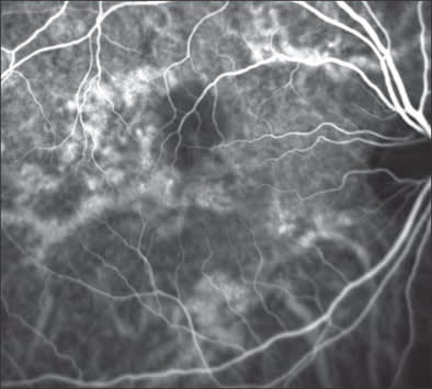 Polypoidal choroidal vasculopathy presents with multiple recurrent serosanguinous detachments of the RPE and neurosensory retina secondary to leakage and bleeding from choroidal vascular lesions (Figure 3A). Yanuzzi and associates describe the characteristic ICG angiographic findings of polypoidal lesions in the choroidal circulation and branching vascular networks (Figure 3B). ICGA can also show increased vascular permeability of the choroidal vasculature that can be indicative of a poorer prognosis.