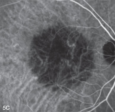 Standard fluence verteporfin photodynamic therapy (PDT) causes choroidal hypoperfusion, which is easily documented by ICGA. This can be helpful to titrate fluence of repeat PDT when used in combination therapy with an anti-VEGF therapy. While mild choroidal hypoperfusion may not be harmful to ultimate VA, those patients with profound VA loss typically have profound choroidal ischemia. Figures 5A-5C demonstrate an early, mid, and late phase ICG 1 week after 40% fluence verteporfin PDT treatment in combination with intravitreal ranibizumab. This particular patient had persistent choroidal hypoperfusion up to 6 months following PDT treatment but maintained 20/25 VA.