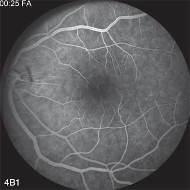 Figure 4 B. FA early and late shows only subtle changes corresponding to the retinal legions.