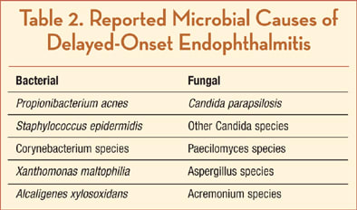 Delayed-onset endophthalmitis is defined as endophthalmitis occurring more than 6 weeks after cataract surgery. Compared to acute postoperative endophthalmitis, chronic cases are typically marked by relatively mild inflammation and an indolent course. Propionibacterium acnes, a gram-positive, anaerobic pleomorphic rod, is a common causative organism. Other causative bacterial organisms may include S. epidermidis, Corynebacterium species, Xanthomonas maltophilia, and Alcaligenes xylosoxidans. Causative fungal organisms may include Candida parapsilosis, other Candida species, Paecilomyces species, Aspergillus species, and Acremonium species.