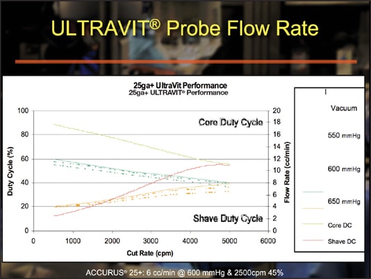 Furthermore, based on the type of tissue being cut and removed, the surgeon can modify the duty cycle to control flow, independent of vacuum and cut rate. The increased efficiency of the system's technology allows flow rates of 8 cc per minute or better at a 5000 cpm cut rate regardless of what gauge is being employed (Figure 2). With appropriate vacuum settings, the surgeon can achieve the same aspiration rate experience and the same flow efficiency at any of the 3 gauges. For example, in a 20-g procedure, flow is 8 cc per minute, using 200 mmHg of vacuum at 5000 cpm. In a 23-g procedure, flow is 8 cc per minute, using 300 mmHg of vacuum at 5000 cpm. And in a 25-g procedure, flow is 8 cc per minute, using 650 mmHg of vacuum at 5000 cpm.