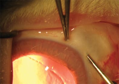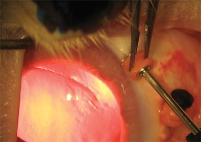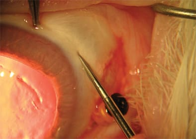 While a 23-g 1-step microcannula insertion technique using the Alcon system is suitable for most eyes with a fragile ocular surface, you can choose a 2-step technique, as described by Eckardt,1 in cases where the risk of force-related complications is high. With this technique, incisions are made with a 23-g microvitreoretinal (MVR) blade before the cannulas are placed using a blunt inserter. One of the cases in my series, for example, involved an eye with late onset acute endophthalmitis and severe anterior multifocal uveal ectasia. Because I was concerned that the forces required to introduce the microcannulas in a 1-step approach could have perforated the eye, I used a 2-step approach before completing the 23-g vitrectomy.