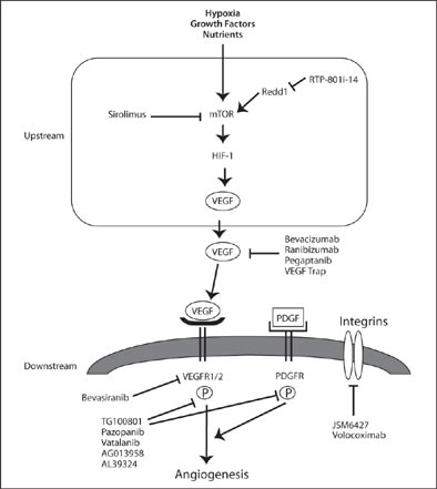 Figure. The angiogenesis process and where certain drugs intervene.