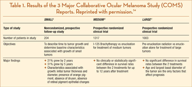- The COMS randomized trial of iodine 125 brachytherapy for choroidal melanoma: V. Twelve-year mortality rates and prognostic factors: COMS report No. 28. Arch Ophthalmol. 2006;124:1684-1693.