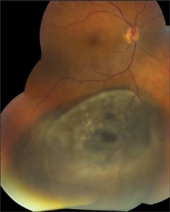 | Figure 3a. A medium-sized melanoma as classified by the COMS criteria prior to treatment. | Figure 3b. Lesion in 3A at 6 months after brachytherapy. Note the early radiation retinopathy. |