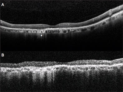 In both cases, atrophy of the retina, as identified on OCT, explains the better visualization of subretinal structures. In particular, choroidal vessels are evident and their limits are sharper than under normal retina areas; even sclera could be visualized under choroidal vessels. Note that, along the scan line, there is an area of hypertrophic RPE area corresponding in retinal imaging to 1 of the residual autofluorescent zones surrounded by atrophy. In Figure 4, a comparison is shown between SD-OCT (top panel) and TD-OCT (bottom panel) images of the right eye. Best-corrected VA in this eye was 20/32 because of a relatively conserved neuroretina in the foveal region. The retina is diffusely thinned so that choroid and choriocapillaris are visible. Note the high backscattering (*) in correspondence of an atrophy area: In SD-OCT imaging, choroidal vessels are more distinguishable than in TD-OCT images.