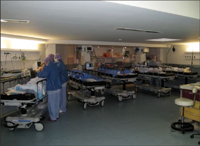 Operating Theater Arrangement. To avoid any circuit congestion, our operating theater differs from most others. In having 2 very large areas of both pre- and postop anesthesia, we are able to admit 20 patients at the same time. The preoperating room is equipped with 8 anesthesia-equipped stations (2 patients in preparation for each OR); the postsurgery room is equipped with 12 (3 patients per OR) (Figures 2 and 3).