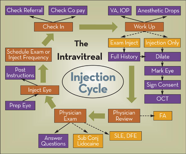 Intravitreal injections have become an integral part of the retinal physicians' practice. While the increased volume of patients may be intimidating, a few adjustments in the patient flow, documentation, scheduling, and training of staff should allow your practice to accommodate and effectively treat your patients for conditions that previously would relegate them to blindness. RP