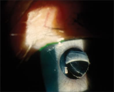 Cataract progression is accelerated following incisional glaucoma surgery, and cataract extraction occurs in approximately half of patients within the first 5 years following glaucoma surgery.27 Unfortunately, phacoemulsification has a significant impact on IOP control in patients with pre-existing functioning blebs. The higher the preoperative IOP, the higher the likelihood for difficult postoperative IOP control. Most postoperative pressure elevations occurring in the early postoperative period are transient and amenable to control with topical pressure-lowering medications. Despite medical IOP control during the postoperative period, 20% to 25% of patients with a history of incisional glaucoma surgery requiring no medical supplementation preoperatively will require supplements permanently after cataract extraction.28 Although this appears to draw a definitive connection between cataract extraction and postoperative elevation of IOP in this population, there is an expected rise over time in IOP in trabeculectomy patients who do not undergo cataract extraction.17 The true mechanism for induction of elevated IOP and flattening of filtering blebs after cataract extraction is not known, but it is believed to be initiated by the general inflammatory response induced by surgery. Subconjunctival scarring causes bleb flattening and resultant dysfunction, but there is not always a direct correlation between bleb appearance and function or IOP control.28 Bleb revision or primary trabeculectomy during cataract surgery are options in those eyes with higher precataract extraction IOP. Filtering blebs that have not fully matured are more likely to fail after cataract extraction than blebs that have matured, and this in turn affects postop IOP control. Failure is due to the susceptibility of the healing bleb to the aforementioned inflammation. An interval between trabeculectomy and cataract extraction of less than 6 months is associated with the need for glaucoma reoperation.28