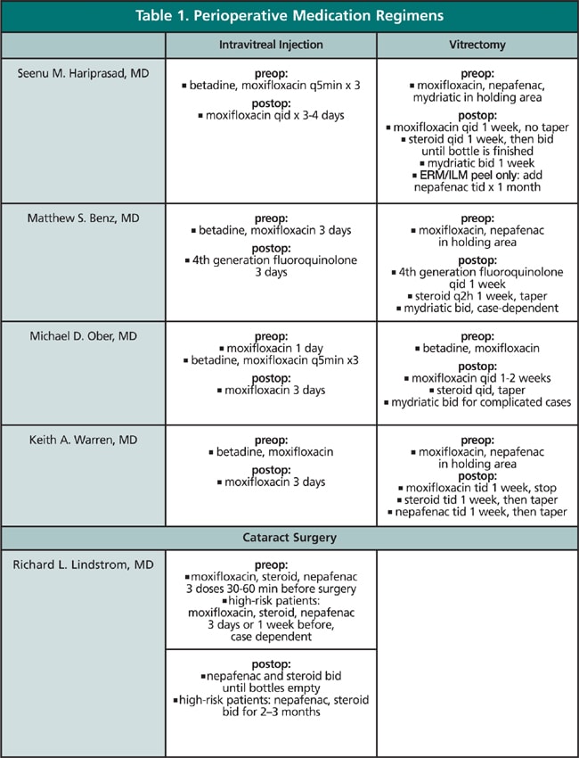 Dr. Hariprasad: We each have a medication regimen that we follow for our patients who are undergoing intravitreal injections or surgical procedures (Table 1). Do you alter how you use the medications, specifically NSAIDs, in high-risk cases?