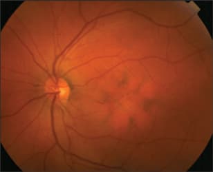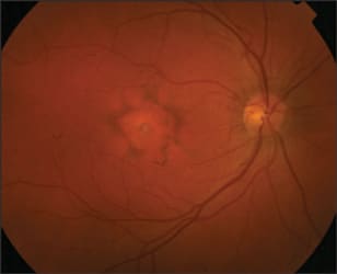 BVMD is an early-onset autosomal dominant disorder with variable penetrance, caused by mutation in the bestrophin gene.1-3 The disorder is clinically characterized by large deposits of lipofuscin-like material in the subretinal space. The phenotypic manifestation is characterized by a "vitelliform" macular lesion, which resembles an egg yolk. BVMD is a continuing disease, the affected macular area becoming more and more involved with a scrambledegg aspect and progressive visual acuity deterioration.1,2
