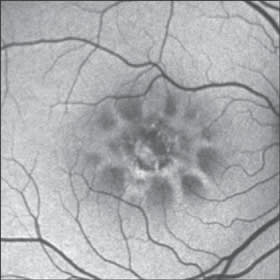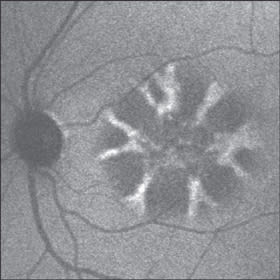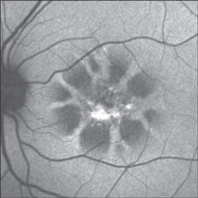Figure 4. Near-infrared autofluorescence. The pattern turned out to be very similar to that detectable on blue-light autofluorescence. A spoke-like distribution of the autofluorescence signal was detectable, surrounding a central area of decreased response.